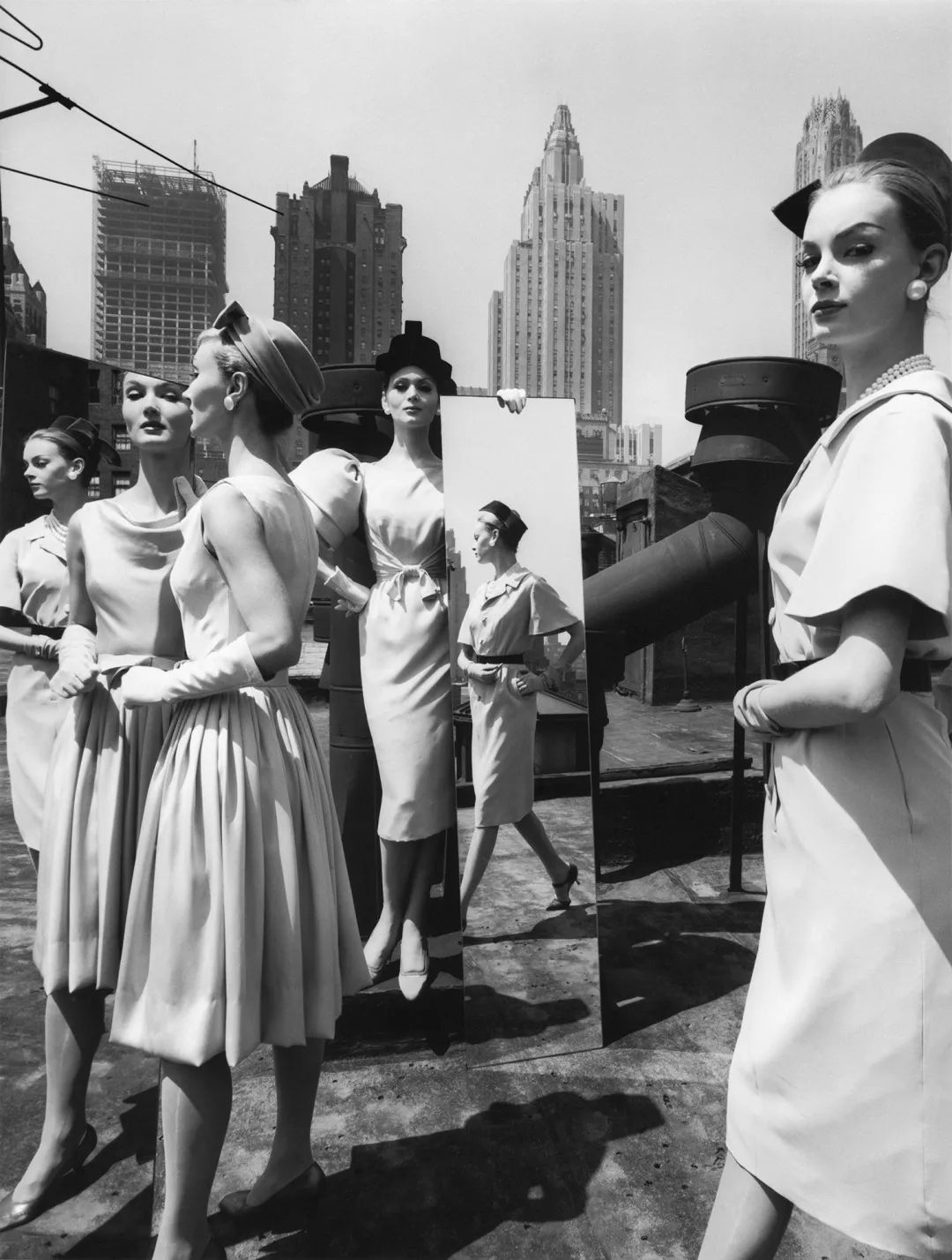 Nina and Mirrors, New York. 1962.《伊芙琳,伊莎贝拉,尼娜和镜子,纽约》1962年;Gelatin silver print. 明胶银盐;19 5/8 × 15 5/8" (49.8 × 39.7 cm);© 2024 William Klein.